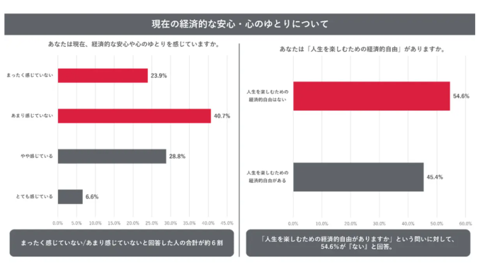 調査の結果、およそ60%が「経済的な安心や心のゆとりを感じていない」、半数以上が「人生を楽しむための経済的自由はない」と回答し、年収500万円以上であっても十分な余裕を実感できていない現状が表面化しました。一方で、「ファイナンシャル・ウェルビーイング」を重要視し、不動産や債券といった将来価値を意識した分散投資を行う層は、経済自由と幸福度ともに高い傾向があることがわかりました。